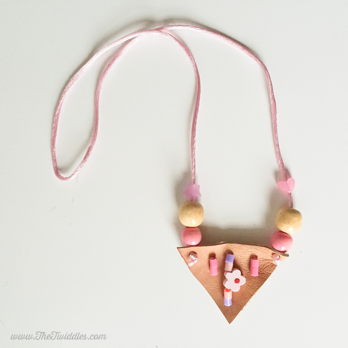 Adorable little necklace has hand-cut triangle leather and hand-stitched beads. Made with lots of love and attention to every detail.